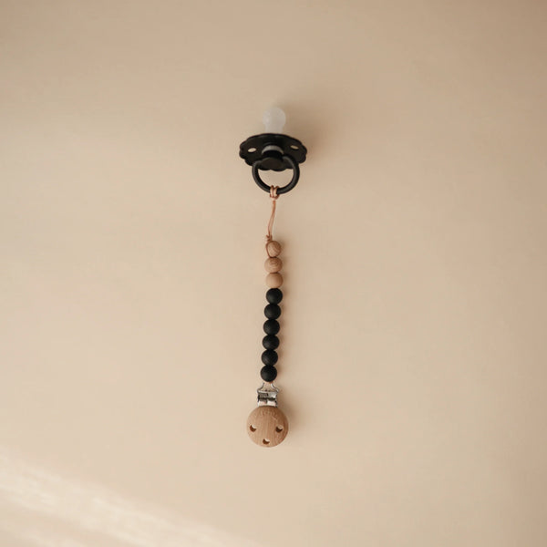 The Mushie silicone pacifier clip offers durability, function and simplicity to families on-the-go. Made from 100% food-grade silicone, our clip features a faux wood silicone clasp that brings a modern take to a traditional favorite. With a simple stack of silicone beads in two complementary colors, the Eva clip offers a sophisticated touch to your pacifier accessories. The clip is easy to clean and helps keep soothing items in reach for little ones.